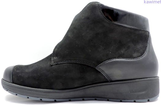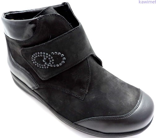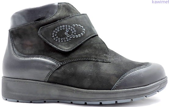 Lekkie botki damskie w poszerzonej tęgości M z wyjmowaną profilowaną wkładką. Cholewka wykonana ze skóry nubukowej. Podeszwa amortyzująca i antypoślizgowa. Delikatnie ocieplone, zapinane na rzep.