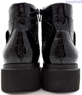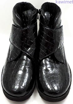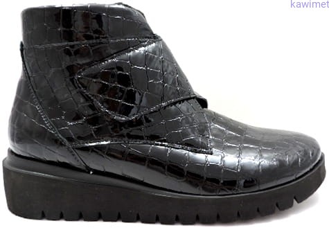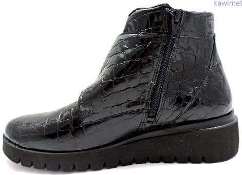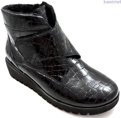 Lekkie botki damskie zapinane na rzep w poszerzonej tęgości H, ocieplane. Od wewnętrznej strony suwak. Wkładka wyjmowana i profilowana. Cholewka wykonana ze skóry lakierowanej. Podeszwa amortyzująca.