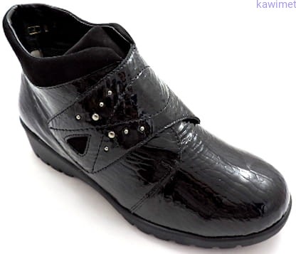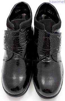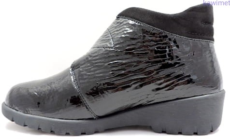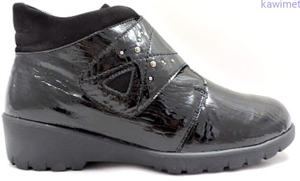 Lekkie botki damskie zapinane na rzep w poszerzonej tęgości K, ocieplane wełną jagnięcą. Wkładka wyjmowana i profilowana. Cholewka wykonana ze skóry lakierowanej. Podeszwa amortyzująca i antypoślizgowa.