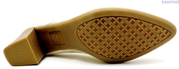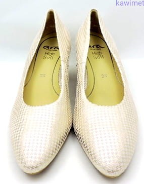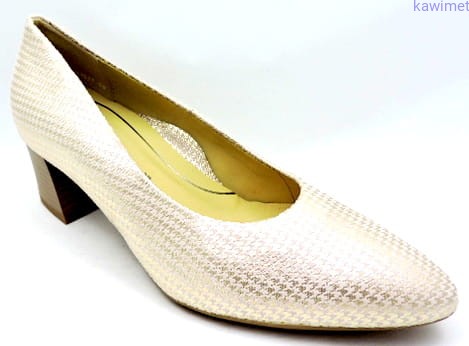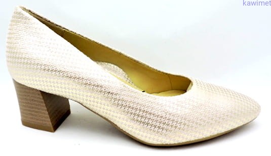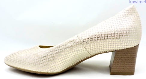 Klasyczne czółenka na wygodnym, niewysokim, 5 cm obcasie. Cholewka wykonana z miękkiej, dopasowującej się do stopy skóry. Lekko wydłużony nosek. Buty są w delikatnym lekko błyszczącym kolorze różowego złota. Bardzo miękka wkładka i elastyczna podeszwa znacząco poprawią komfort podczas chodzenia. Idealne sprawdzą się letnich strojów.