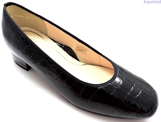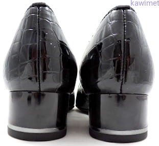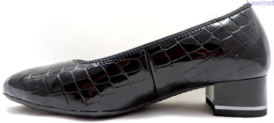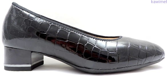 Klasyczne czółenka damskie na 35 mm obcasie w poszerzonej tęgości H. Cholewka wykonana ze skóry lakierowanej tłoczonej. Bardzo miękka wkładka i elastyczna podeszwa zapewni komfort podczas chodzenia.
