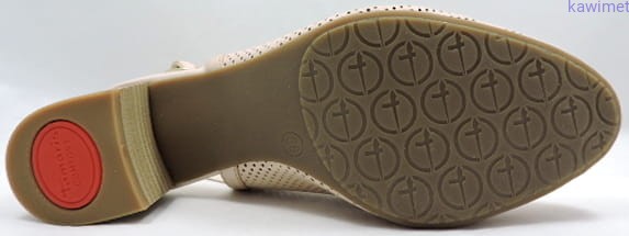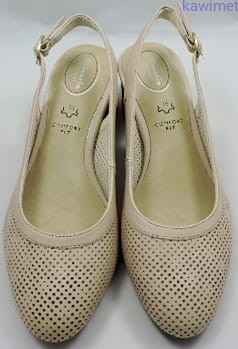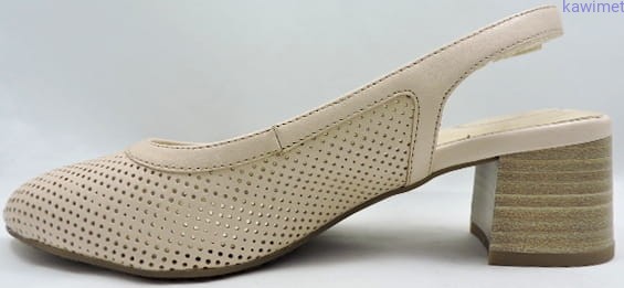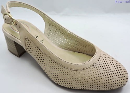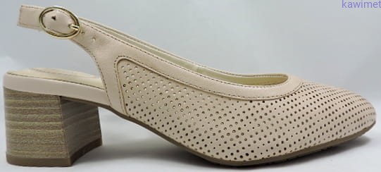 Czółenka damskie letnie na 55mm obcasie zapinane na klamerkę. Cholewka wykonana ze skóry licowej, perforowane. Miękka wkładka poprawia komfort użytkowania.