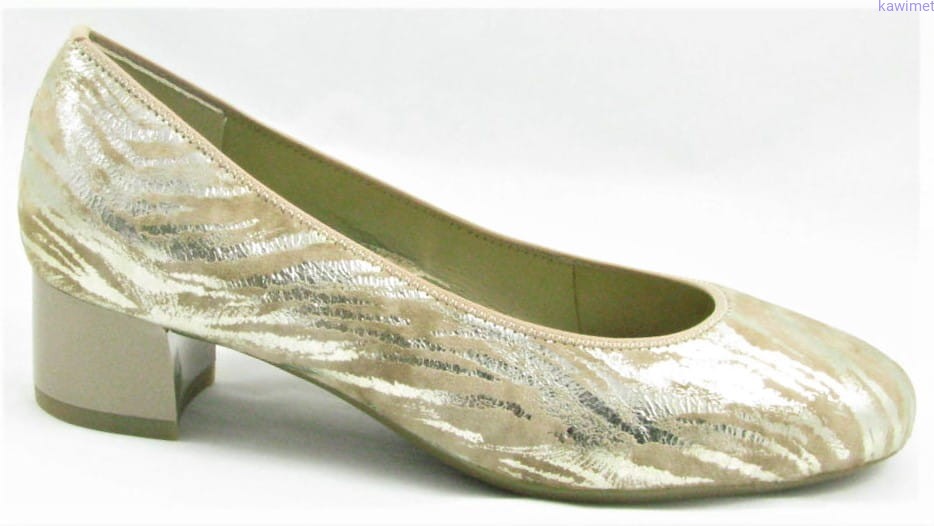 Czółenka damskie na stabilnym 3,5 cm obcasie. Cholewka wykonana ze skóry nubukowej z dyskretnym printem, obcas dopasowany kolorystycznie. Bardzo miękka wkładka znacząco poprawia komfort użytkowania.