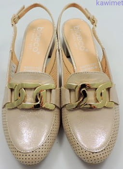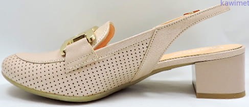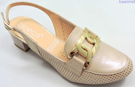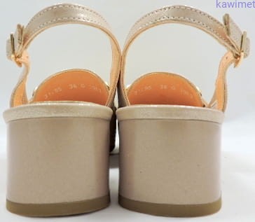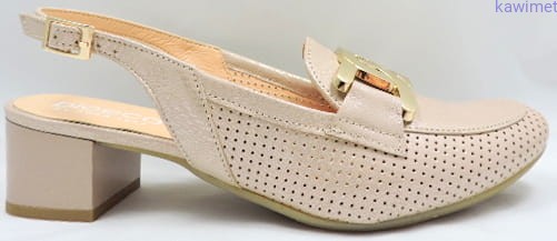 Czółenka damskie letnie 40mm obcasie. Otwarta pięta i zaokrąglony nosek. Cholewka perforowana wykonana ze skóry licowej błyszczącej ze złotą ozdobą.