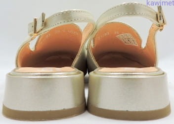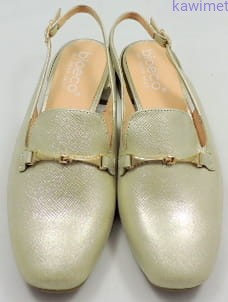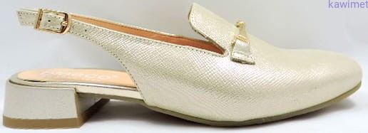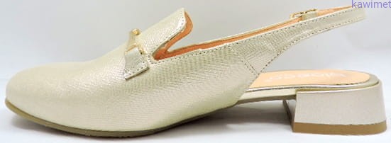 Czółenka damskie letnie 25mm obcasie. Otwarta pięta i zaokrąglony nosek. Cholewka wykonana ze skóry licowej błyszczącej z delikatną złotą ozdobą.
