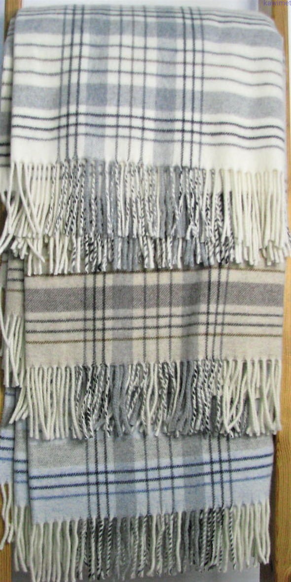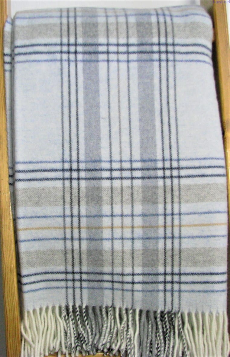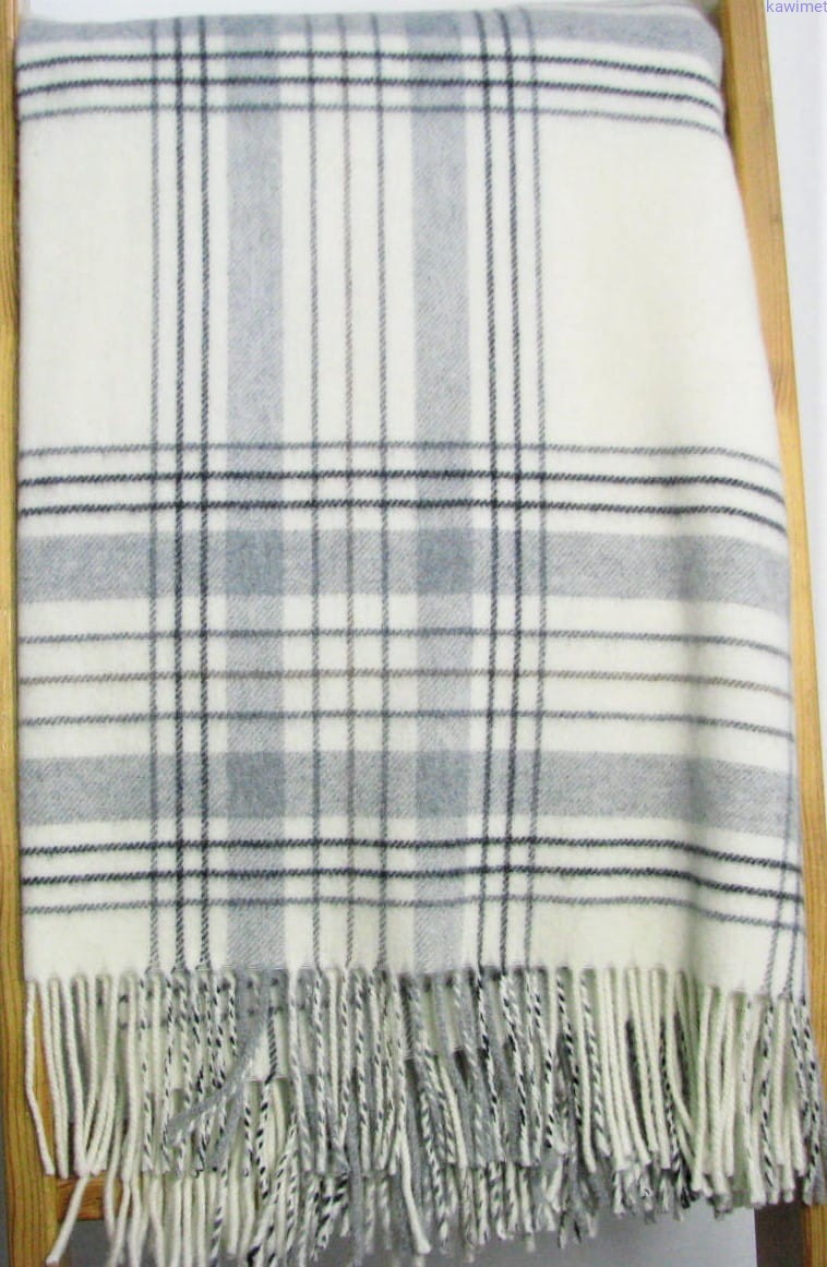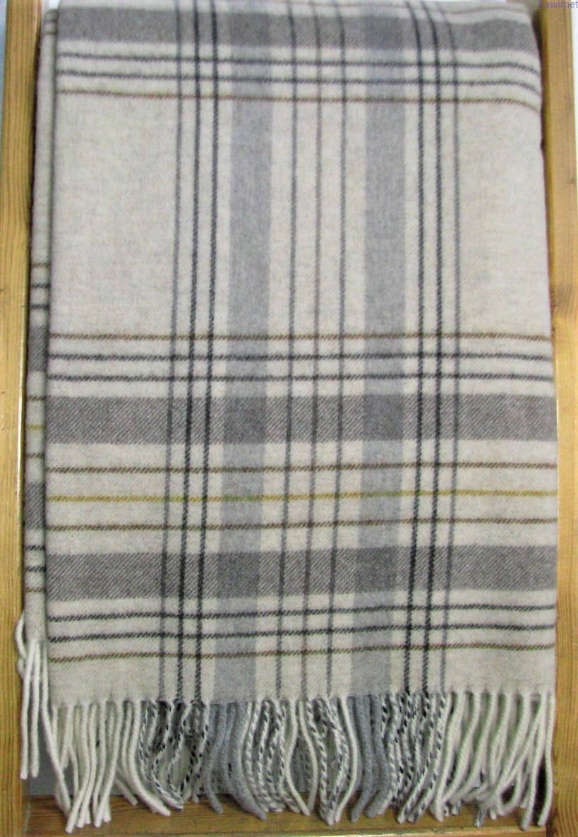 Miękki koc z wełny jagnięcej w kratkę. Dostępny w trzech kolorach. Szczegółowy przepis prania na metce.