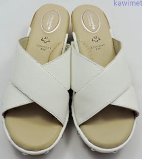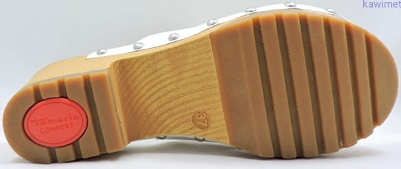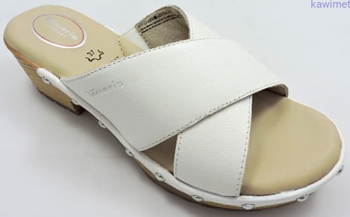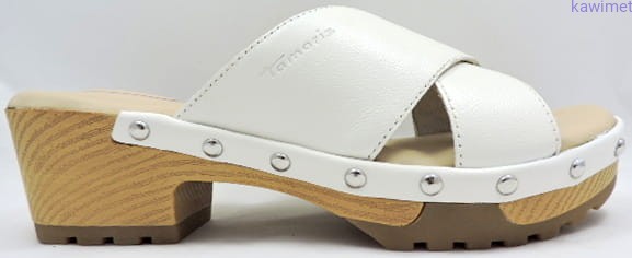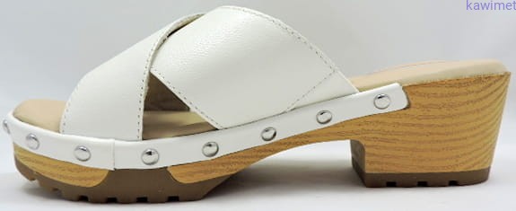 Klapki damskie na 50mm obcasie. Cholewka wykonana ze skóry licowej. Podeszwa jest imitacją drewna. Miękka wkładka poprawia komfort użytkowania.