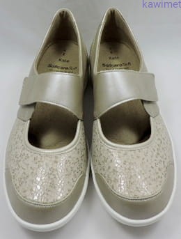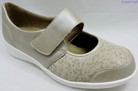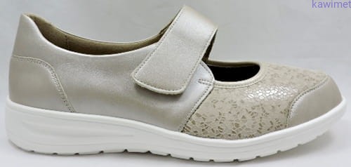 Bardzo wygodne półbuty damskie w poszerzonej tęgości K. Cholewka wykonana ze skóry licowej i elastycznego streczu. Wkładka profilowana, z możliwością wyjęcia. Na podbiciu regulacja za pomocą rzepa.
